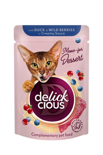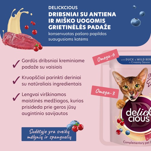 Delickcious™ dribsniai kreminiame padaže katėms – antiena ir miško uogos (konservai)