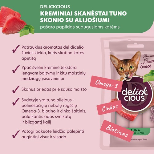 Palepinti augintinį su nauda jo sveikatai?Taip, tai Delicksious kreminiai skanėstai. Sultingas tunas dėl švelnios tekstūros dar lengviau įsisavinamas. Patogu ir skanu derinti su kasdieniu maistu – ypač su sausu maistu. Paįvairina katės racioną ir skatina apetitą. Sudėtyje yra visi būtini mikroelementai. Viskas, kad suteiktų jūsų katei džiaugsmą.