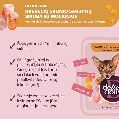 Delickcious™ sriuba su sardinėmis, krevetėmis ir moliūgu. Visavertis konservuotas maistas suaugusioms katėms, 0,08 kg