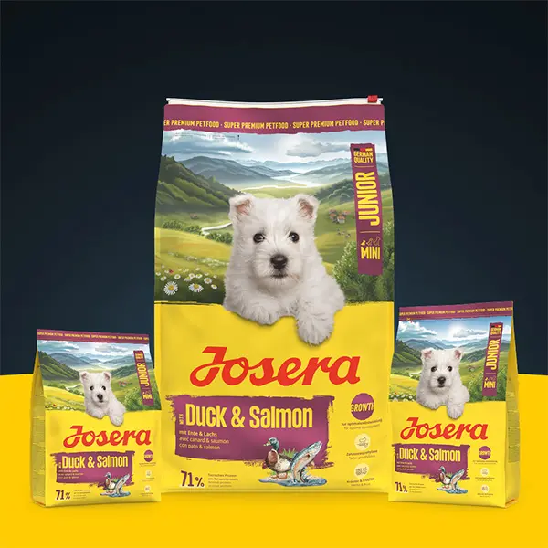 Josera sausas maistas mažų veislių, jauniems šuniukams su antiena ir lašišų mėsa, padedantis užtikrinti tinkamą šuniukų vystymąsi.