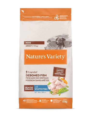 Nature’s Variety Healthy Grain Adult Mini su baltąja žuvimi – sausas maistas mažų veislių šunims, 1,5 kg