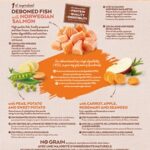Sudėtis: Iškaulinta norvegiška lašiša* (16%), džiovinti tuno baltymai (15%), džiovinti žirniai* (13%), džiovintos bulvės* (11%), paukštienos riebalai* (8%), saldžios bulvės* (6%), džiovinti lašišos baltymai (6%), žirnių baltymai* hidrolizuoti gyvūniniai baltymai (paukštiena, kiauliena, žuvis) (4%), runkelių minkštimas*, mineralai, džiovintos morkos* (0,5% atitinka 4% šviežių morkų) atitinka 4% šviežių morkų), dehidratuoti obuoliai* (0,3% atitinka 2% šviežių obuolių), džiovinti jūros dumbliai (rudadumbliai)* (0,01%), džiovintas rozmarinas* (0,01%). *Natūralūs ingredientai