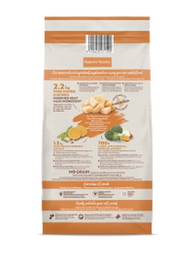 Sudėtis: iškaulinta laisvai laikomų vištų mėsa* (32%), džiovinti vištienos baltymai (32%), džiovinti žirniai* (9%), paukštienos riebalai* (5.5%), žirnių krakmolas*, džiovinti avinžirniai* (4%), džiovintos saldžios bulvės* (4%), baltymų hidrolizatas (2.5%), džiovinta cikorijos šaknis*, žuvų taukai* (0.5%), džiovintos morkos* (0.5% atitinka 4% šviežių morkų), džiovinti brokoliai* (0.5% atitinka 4% šviežių brokolių), džiovinti obuoliai* (0.3% atitinka 2% šviežių obuolių), mineralai, džiovinti rudadumbliai* (0.01%), džiovinti rozmarinai* (0.01%). *Natūralūs ingredientai.
