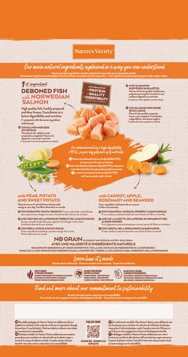 Sudėtis: Iškaulinta norvegiška lašiša* (20%), džiovinti tuno baltymai (18%), džiovinti žirniai* (15%), džiovintos bulvės* (8%), paukštienos riebalai* (7%), saldžios bulvės* (4%), hidrolizuoti gyvūniniai baltymai (paukštiena, kiauliena, žuvis) (4%), žirnių krakmolas* runkelių minkštimas* žirnių krakmolas*,, mineralai, džiovintos morkos* (0,5% atitinka 4% šviežių morkų) atitinka 4% šviežių morkų), džiovinti obuoliai* (0,3% atitinka 2% šviežių obuolių), džiovinti jūros dumbliai (rudadumbliai)* (0,01%), džiovintas rozmarinas* (0,01%). *Natūralūs ingredientai