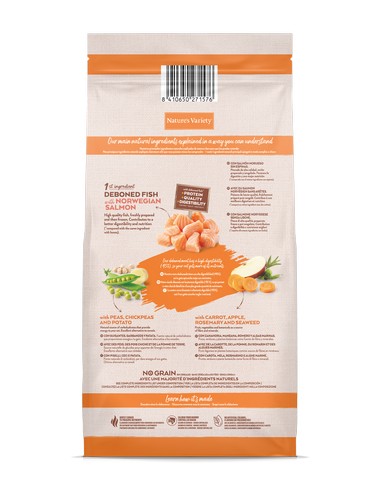 Begrūdis, pilnai subalansuotas suaugusių kačių maistas. Norvegiška lašiša yra pagrindinis ingredientas. Praturtintas vaisiais, daržovėmis, supermaistu ir natūraliais alternatyvių angliavandenių šaltiniais. Sudėtis: Iškaulinta norvegiška lašiša* (30%), džiovinti žirniai* (13%), bulvių baltymai, džiovinti tunų baltymai (8%), džiovintų lašišų baltymai (7%), žirnių krakmolas*, džiovinti avinžirniai* (4,5%), džiovintos saldžios bulvės* (4%), paukštienos riebalai* (3%), baltymų hidrolizatas (3%), žirnių skaidulos*, džiovinta cikorijos šaknis*, mineralai, džiovintos morkos* (0.5% atitinka 4% šviežių morkų), džiovinti brokoliai* (0.5% atitinka 4% šviežių brokolių), džiovinti obuoliai* (0.3% atitinka 2% šviežių obuolių), džiovinti rudadumbliai* (0.01%), džiovinti rozmarinai* (0.01%). *Natūralūs ingredientai Priedai, kg: Vitaminas A 27000 TV, Vitaminas E 410 mg, Vitaminas C 350 mg, taurinas 1000 mg, geležies (II) sulfato monohidratas 260 mg (Fe: 86 mg), kalio jodidas 1.9 mg (I: 1.4 mg), vario (II) sulfato pentahidratas 33 mg (Cu: 8.8 mg), mangano sulfato monohidratas 123 mg (Mn: 40 mg), cinko sulfato monohidratas 352 mg (Zn: 128 mg), natrio selenitas 0.24 mg (Se: 0.11 mg). Zootechniniai priedai: Amonio chloridas 5 g. Analitinės sudedamiosios dalys: žali baltymai 37%, žali riebalai 15%, žalia ląsteliena 4%, žali pelenai 8.5%, Ω3 1.1%, Ω6 2.1%.