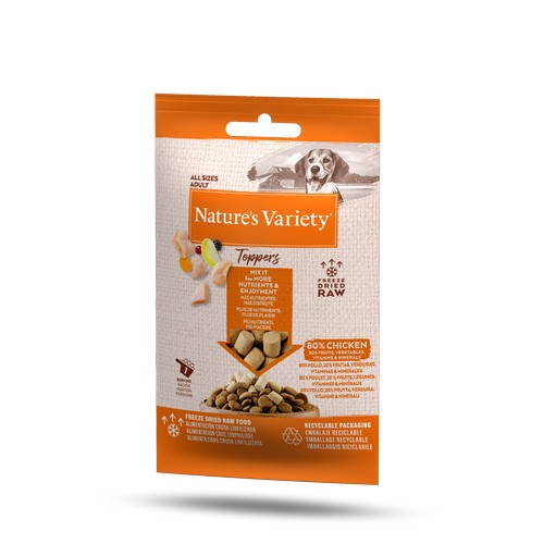 Nature’s Variety Toppers liofilizuoti pašaro paskaninimai su vištiena. Šuo nenoriai valgo ir žiūri į savo pašarą? Mes sukūrėme produktą, kuris paskanins, bet kokį pašarą. Užberkite Nature’s Variety Toppers ant savo šuns pašaro ir stebėkite kaip tuštėja pašaro dubenėlis.