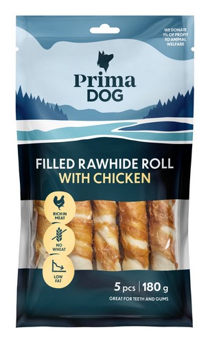 PrimaDog įdarytas kramtomasis ritinėlis su vištiena – tai skanus užpildytas kaulas, kurio kiekvienas kąsnis suteikia malonumą net išrankiems šunims. Kramtant žaliavinė oda padeda natūraliai valyti dantis, o aplink kaulą suvyniota vištienos krūtinėlės filė slepia ypatingą vištienos kepenėlių įdarą, suteikiantį skonio siurprizą jūsų augintiniui.