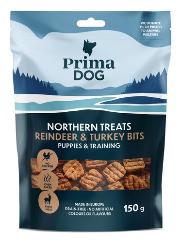PrimaDog Šiaurės Skanukai – Elnienos & Kalakutienos kąsneliai šuniukams ir treniravimui 150 g