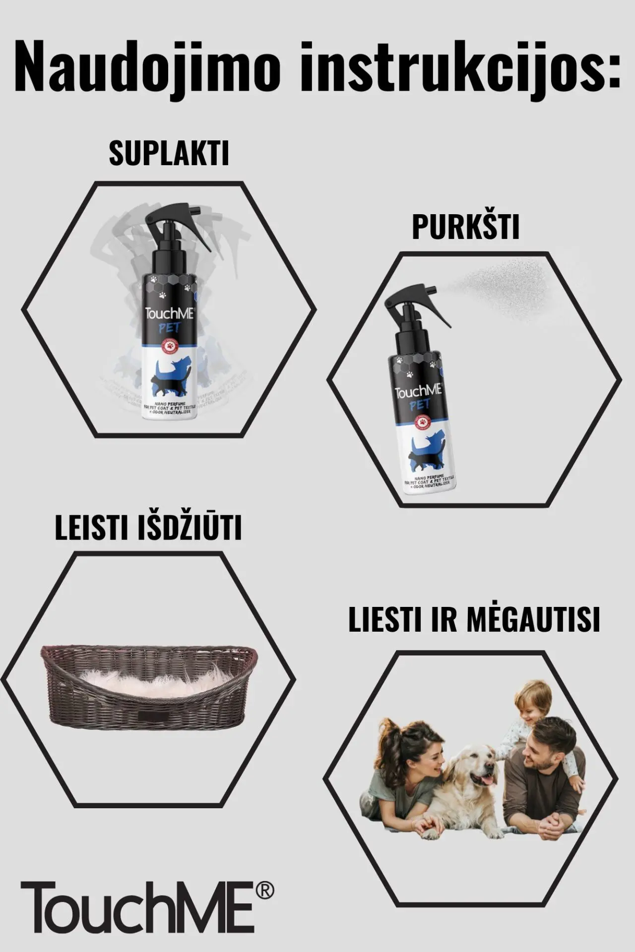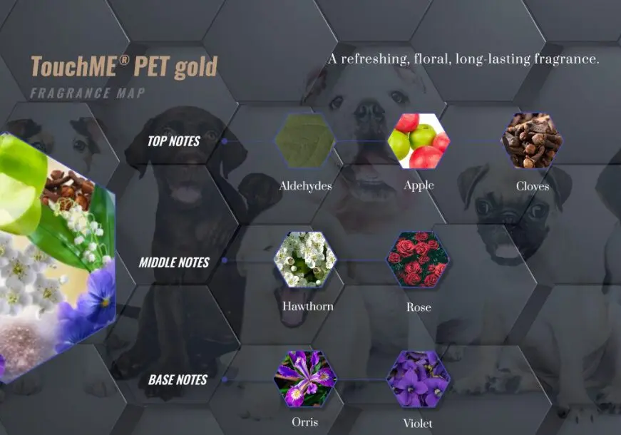 „TouchME® Pet“ yra revoliuciniai naminių gyvūnėlių kvepalai ir blogų kvapų neutralizatorius kailiui bei audiniams. Sudėtyje yra kvapų nanokapsulių, kurios prilimpa prie augintinio kailio ir išskiria kvepalus tik tada, kai jas aktyvuoja fizinis prisilietimas.
